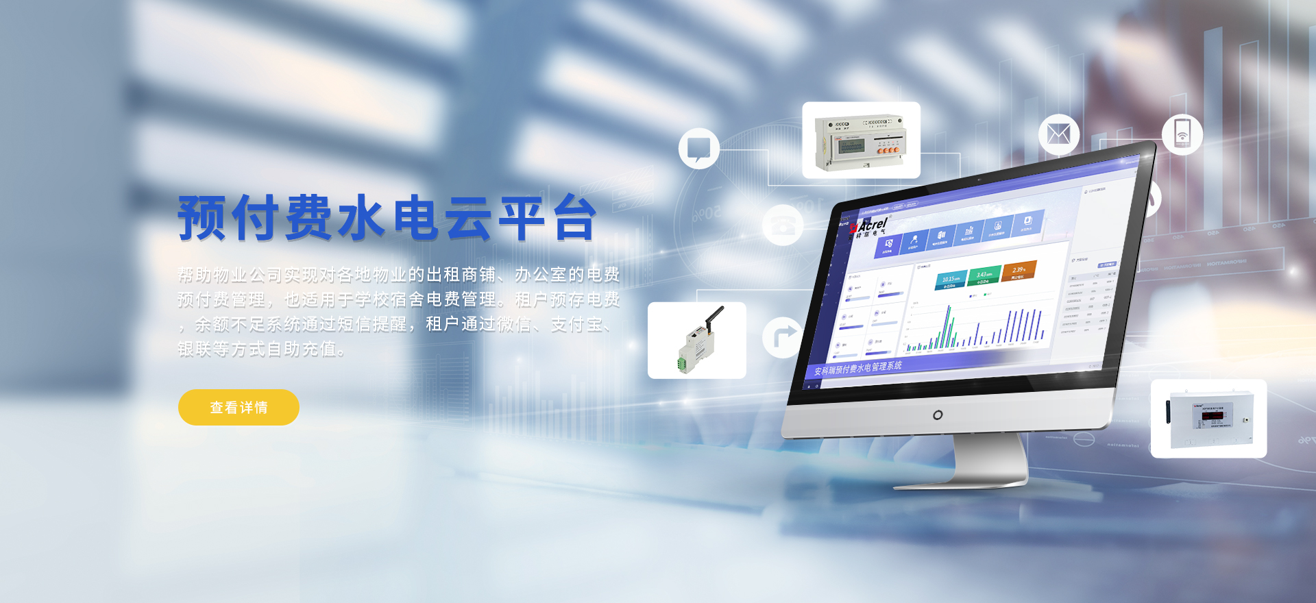 安科瑞提供的解決方案包括Acrel-EIoT能源物聯網云平臺、變電所運維云平臺安全用電管理云平臺、環保用電監管云平臺、智慧消防云平臺、能源管理云平臺、工業企業能源管控平臺、遠程預付費云平臺、餐飲油煙監管云平臺電動汽車/電瓶車充電樁收費管理云平臺、電力監控/無線測溫系統、電能質量治理系統、電氣火災監控系統消防設備電源監控系統、防火門監控系統應急照明和疏散指示系統、智能照明控制系統、醫用隔離電源絕緣監測系統等,幫助用戶實現能源智能化、可視化、精細化管理,提高用能效率和用能安全,為企業節能降耗和實現能源數字化建設提供數據服務。